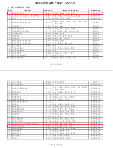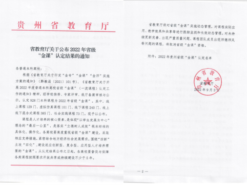 根据《省教育厅关于印发“金专”“金课”“金师”实施方案的通知》(黔教函(2021)101号)、《省教育厅关于开展2022年度普通本科高校省级“金课”(一流课程)认定工作的通知》精神,经公司推荐、专家评审、教育厅备案审核与公示,认定928 门本科课程为2022年省级“金课”。其中,线上课程129门、虚拟仿真课程101门、线下课程240门、线上线下混合式课程385门、社会实践课程73门。