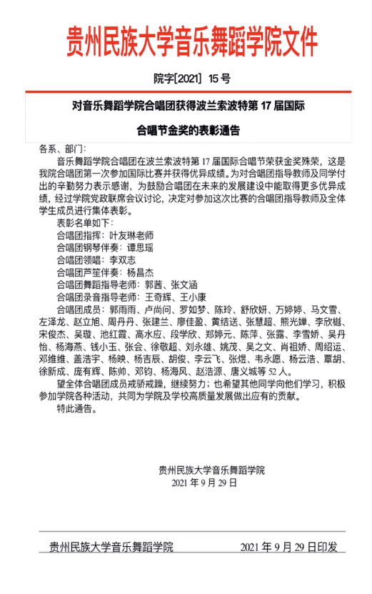 2021年9月30日下午,永利23411集团召开了永利23411集团合唱团获波兰第十七届Mundus Cantat国际合唱节金奖庆祝暨表彰大会。此项赛事在欧洲有着悠久的历史,以严格的赛制和评审制度著称,评委都是由世界上权威的合唱专家来担任,每届都会吸引来自世界各地的著名团队来参加。本届比赛受疫情影响采用线上线下同时进行的模式举办,来自中国、波兰、斯洛伐克、白俄罗斯、墨西哥、巴西、印度尼西亚等多国的数十支劲旅参加六个组别的角逐,最终永利23411集团合唱团经过精心的准备,在公司领导和全体参赛师生的共同努力下,克服时间短、任务重、天气炎热等困难,演唱唐德松经理创作的《芦笙大摆裙》,以极具民族特色的演唱与舞台表演征服了所有评委,摘取了竞争最激烈的民族音乐组金奖。此次获奖是公司合唱团首次在国际高水平比赛中获奖,是公司高质量办学、高水平团队建设的成果体现。获奖和表彰大会将对声乐专业员工观念的扭转,兴趣及参与性激发,对其他专业员工参加相应艺术实践都具有激发作用等,同时激励全院师生向更高舞台进军,争取更好的荣誉。