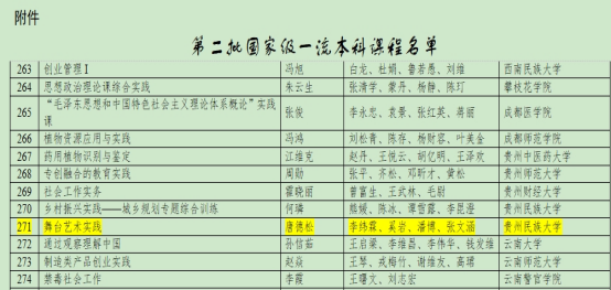 2023年5月,由公司由唐德松经理负责的《舞台艺术实践》(见附件1)获批第二批社会实践类国家级一流本科课程,是公司多年来都非常重视员工舞台艺术实践培养的成果的结晶。这是公司迄今获得的继《贵州少数民族音乐》之后的第二门国家级一流本科课程,也是公司国家级一流专业建设点《音乐表演》建设成果的集中体现。开设的《贵州少数民族音乐》《贵州少数民族歌曲鉴赏与习唱》《少数民族语言(侗语)》《贵州民族民间音乐文化与表演》4门公共选修课有序推进。